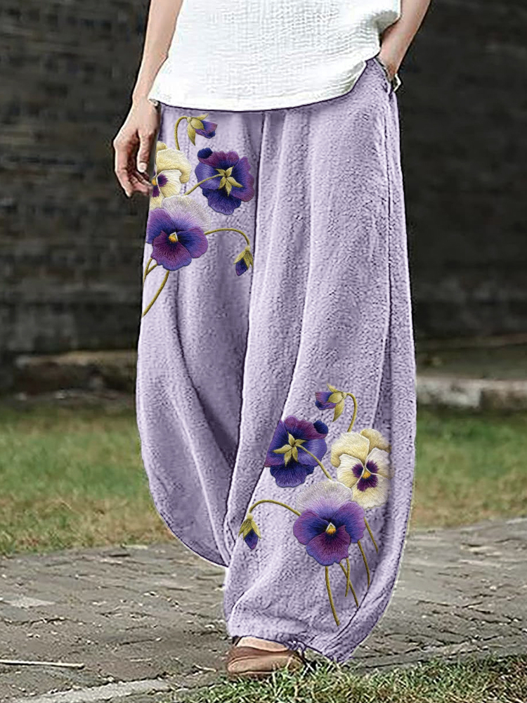 Pansy Flowers Embroidered Linen Blend Wide Leg Pants
