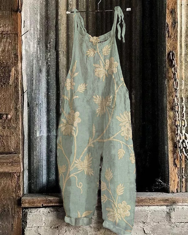 Retro Floral Art Print Casual Loose Jumpsuit