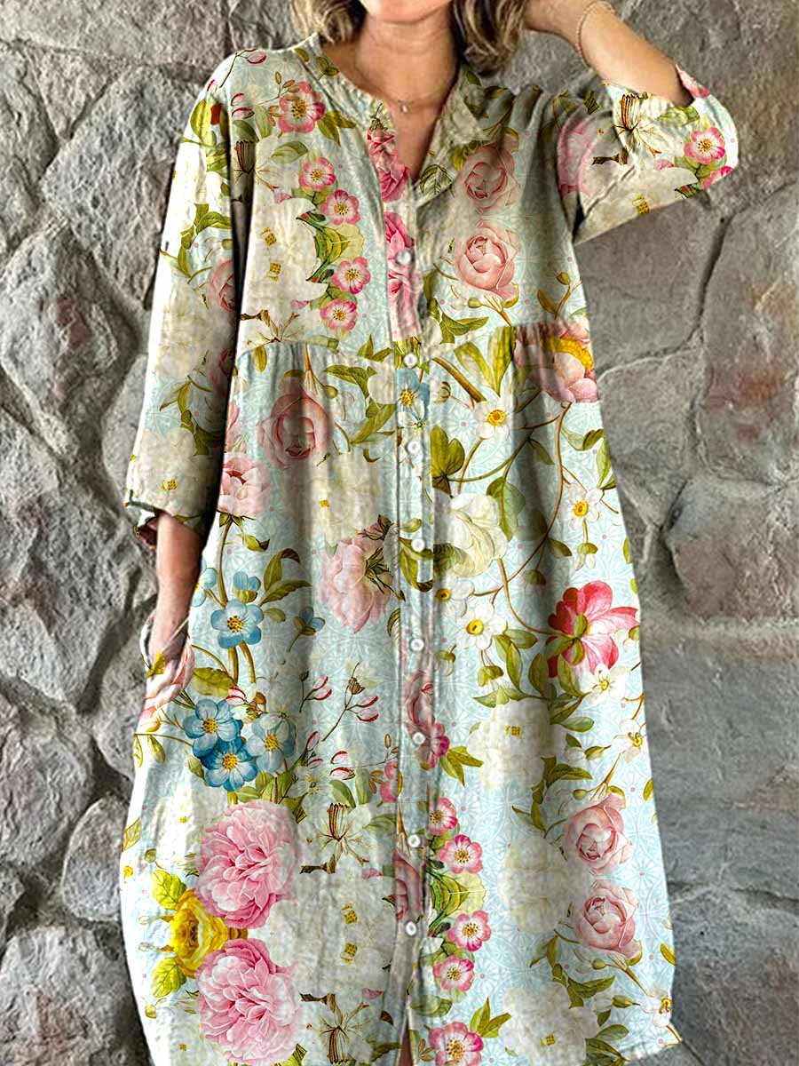 Women's Elegant Floral Pattern Cotton and Linen Dress with Pockets