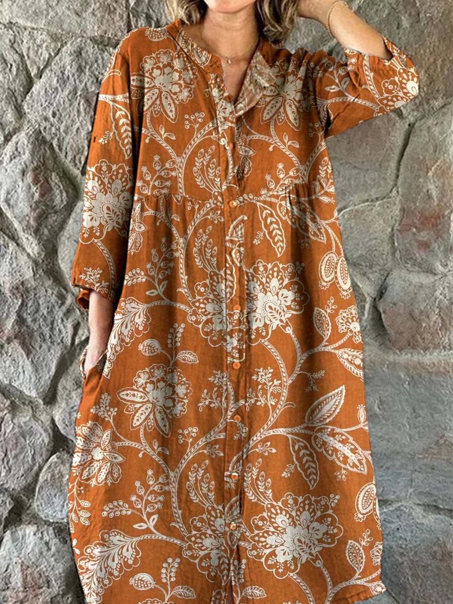Women's Elegant Simple Shirt Style Cotton and Linen Dress with Decorative Floral Print