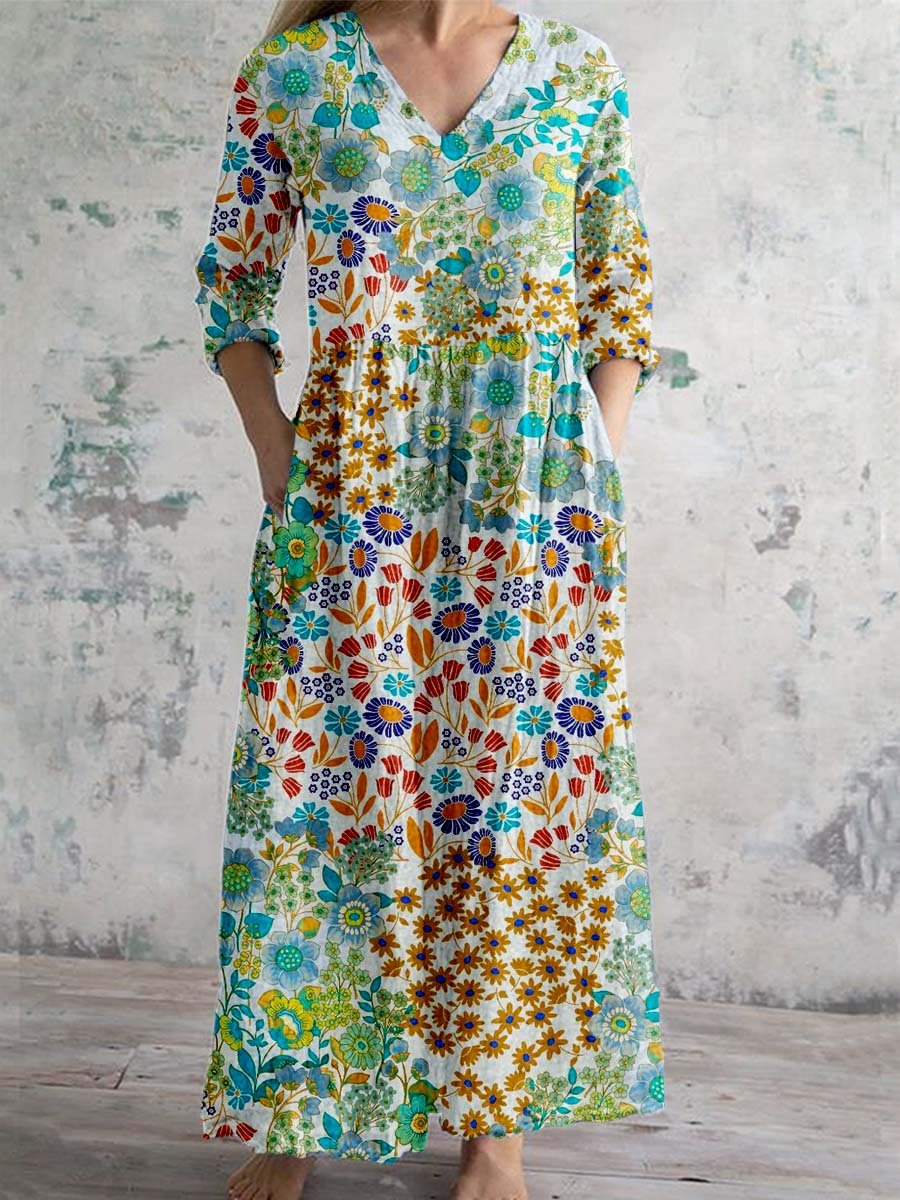 Women's Elegant Vintage Floral V-Neck Cotton and Linen Dress with Pockets