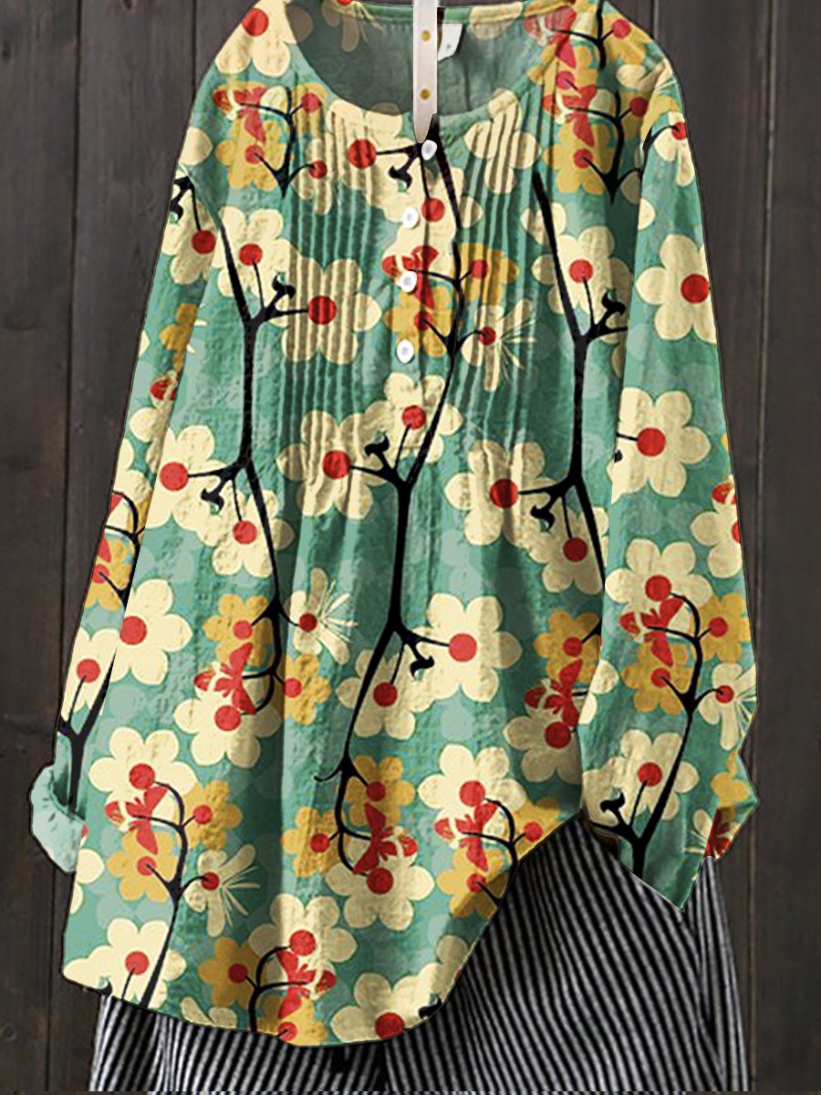 Women's Retro Flower Art Print Casual Cotton And Linen Shirt