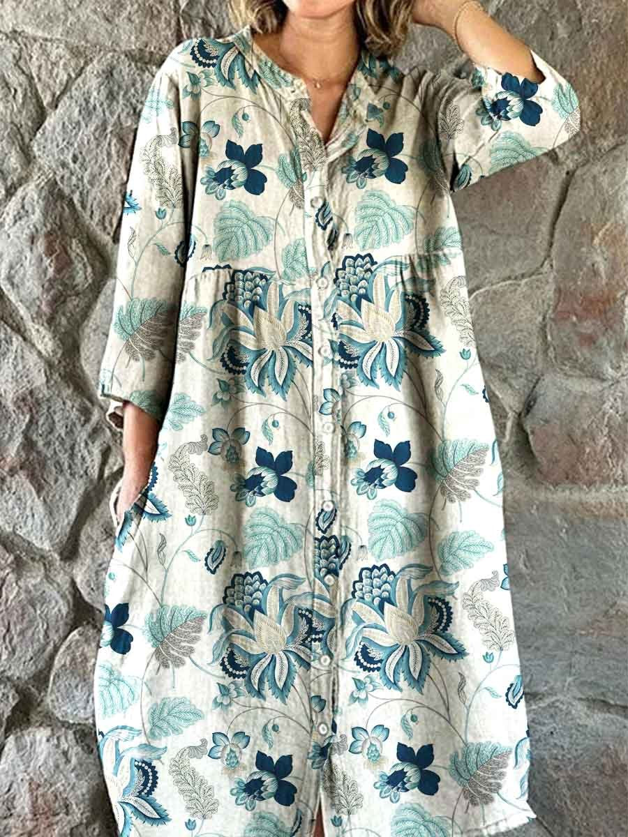 Women's Shirt Style Elegant Simple Floral Pattern Cotton And Linen Dress With Pockets