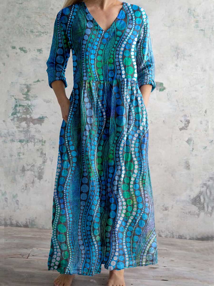 Women's V-neck Elegant Art Polka Dot Print Pattern Cotton and Linen Dress with Pockets
