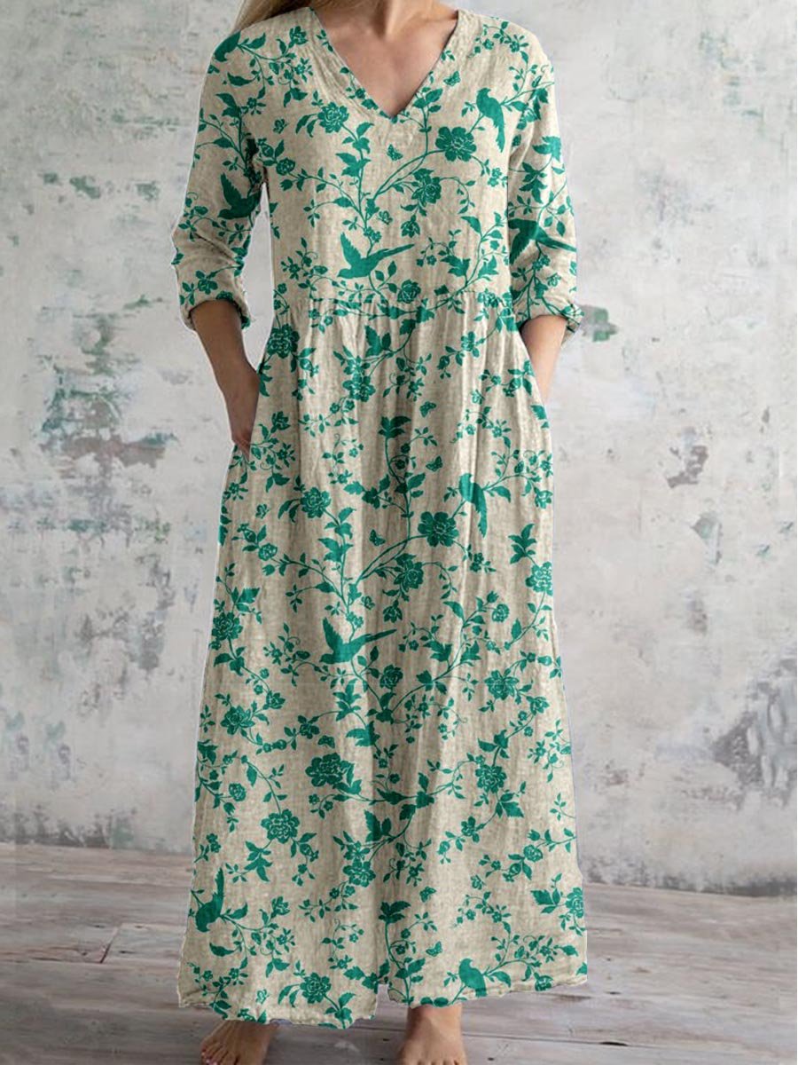 Women's V-neck Elegant Simple Rose Foral Pattern Cotton And Linen Dress With Pockets