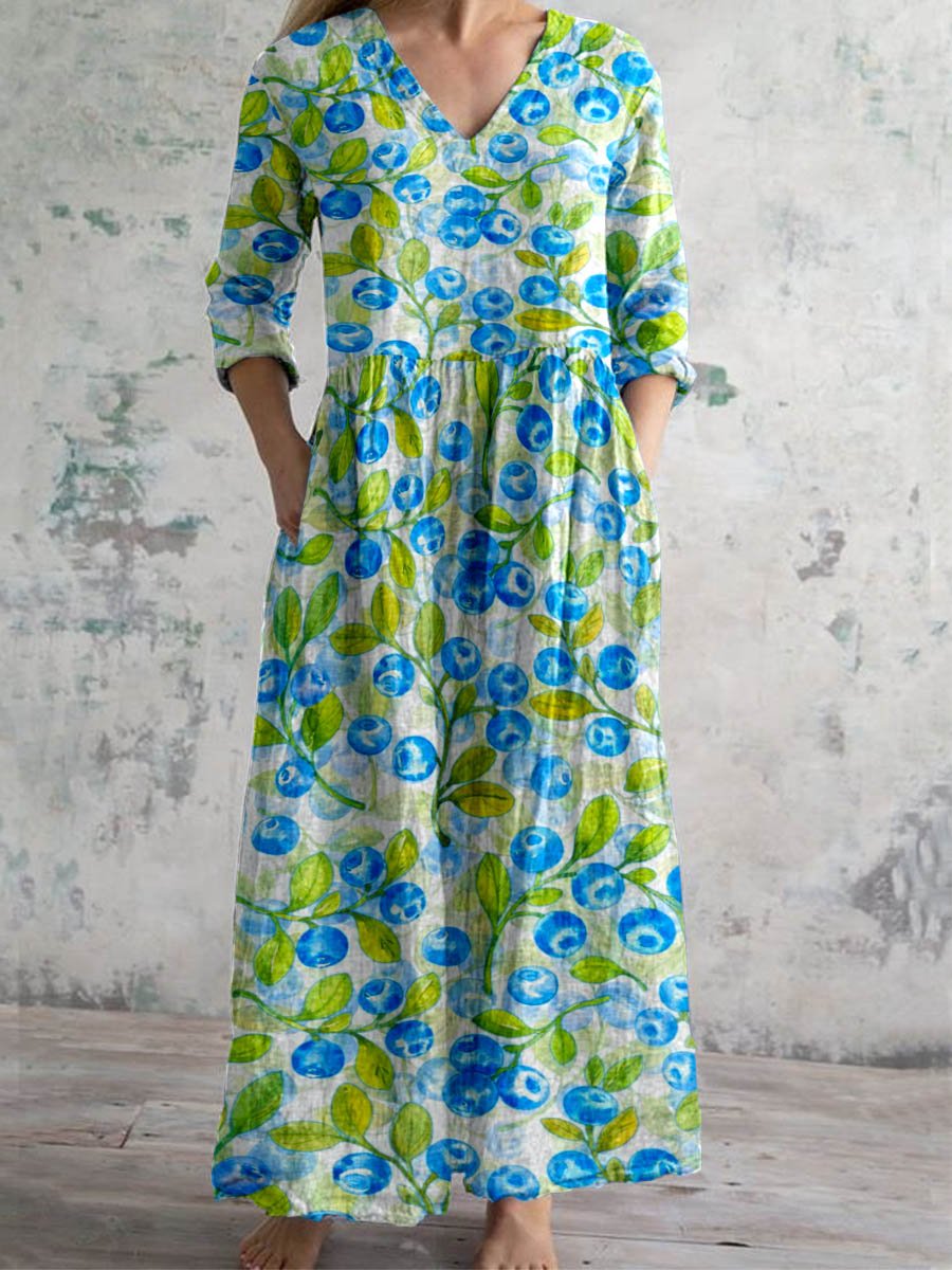Women's V-neck Summer Blueberry Fruit Pattern Cotton And Linen Dress With Pockets