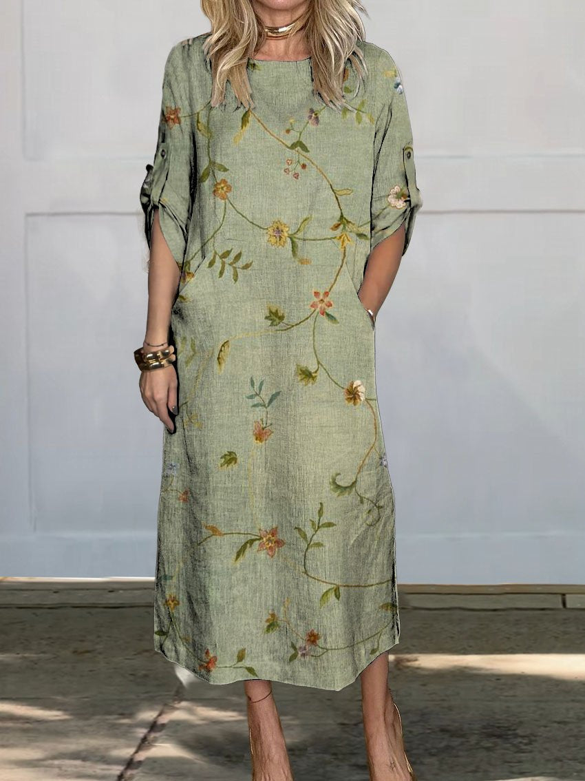 Women's Vintage Floral Art Printed Casual Comfortable Linen Pocket Dress