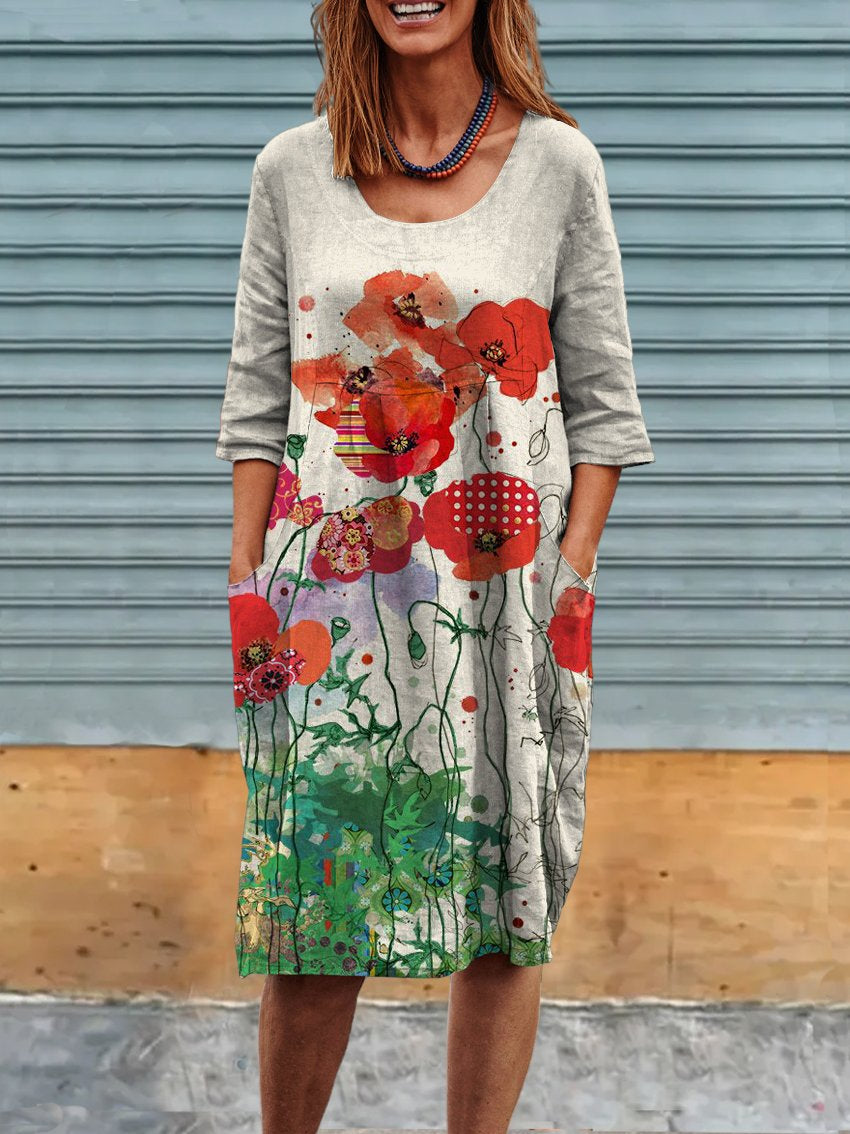 Women's Watercolor Simple Flower Poppy Linen Pocket Tunic Dress